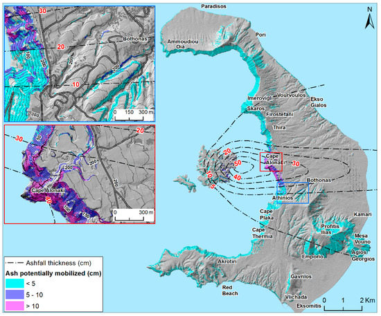 The ashfall distribution from the sub-Plinian eruption scenario in the Nea Kameni volcano is eastward oriented along the dominant winds, as shown in Figure 7 [59]. The contours display thickness values starting from a minimum of 5 cm to a maximum of 50 cm; the highest values are located close to the eruptive center, and do not reach Thira Island. The results of the potential ashfall mobilization are strongly conditioned by ash distribution and thickness. Generally, the highest values are found in a central sector of the inner rim (MGU II), between Cape Alonaki and Athinios.
