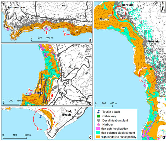Details of the highest susceptibility areas for the three phenomena (see Section 4) and main critical areas (red circles, which are representative of the pictures shown in Figure 9). (a) Oia docks and desalinization plant; (b) Athinios harbor and its road; (c) Red beach; (d) Thira and Imerovigli.