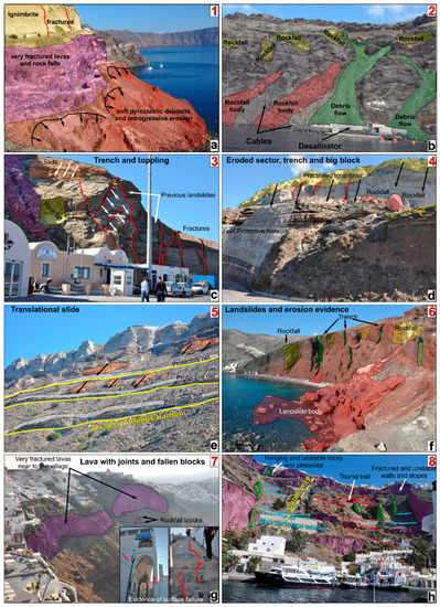 Images representing the most critical areas due to active or potential landslide triggering (location in Figure 8). (a) Cliffs over Oia; (b) Cliffs over desalinization plant; (c–e) Cliffs over Athinios; (f) Red Beach; (g) Skaros Cliff; (h) Thira harbor.