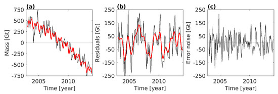 Procedure for quantifying the noise level in mass change time series. (a) Original mass change time series of the AIS (black) and the fitted linear, periodic (1 yr, 1/2 yr, 161/365.25 yr) and quadratic model (red). (b) Mass change residuals (black), i.e., original mass change minus fitted model. Red line: Low-pass filtered residuals using a Gaussian average ( months). (c) High-pass filtered residual, i.e., residuals minus low-pass filtered residuals. The noise assessment is based on the standard deviation of this time series.