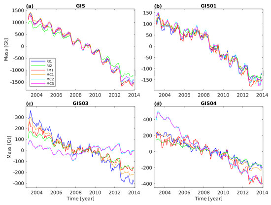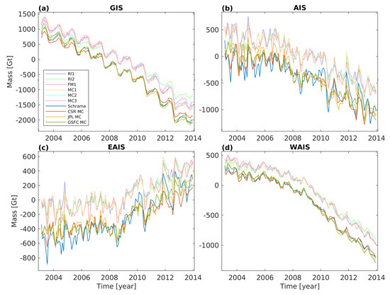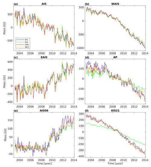 GRACE monthly solutions had to be corrected for GIA using two available models, provided in terms of temporal changes of Stokes coefficients (unit: yr). The GIA predictions by A et al. [23], based on the ICE-5G [24] ice load history, were prescribed for applications to the GIS. In the AIS processing, GIA predictions according to the IJ05_R2 model [25] had to be applied. Hence, two different versions of GIA-corrected GRACE data had to be used for the generation of the AIS and GIS results. GIA models still exhibit large uncertainties. However, assessing the GIA model uncertainties is out of the scope of this studies. By prescribing the two GIA models listed above we just wanted to increase the consistency between the results with respect to the linear trends.