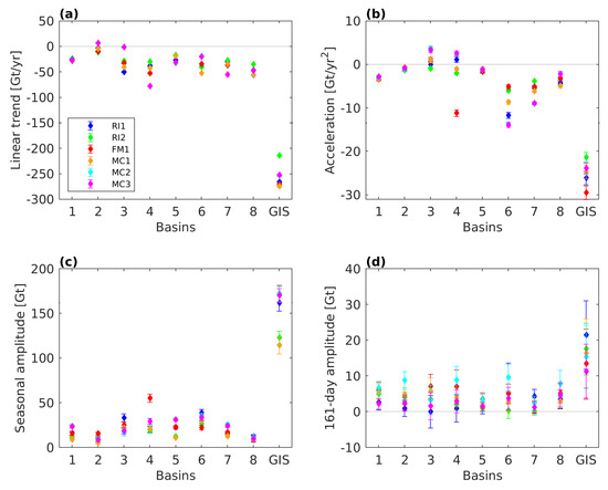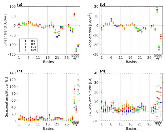 Figure 4 illustrates the temporal variations in mass change time series derived using the standard model, i.e., linear trend, acceleration, amplitudes of seasonal (combined annual and semi-annual) and 161-day signal. The numerical values of all estimated parameters including their formal errors from the least squares adjustment are summarised in Tables S1–S3.