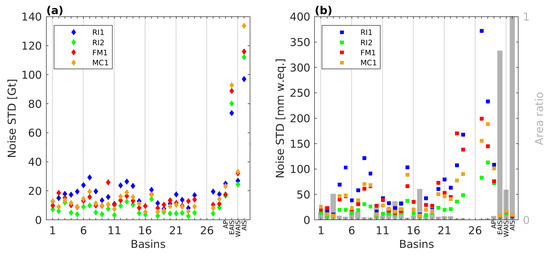 Noise level, given in terms of the scaled standard deviation of the noise time series, for all AIS basins and aggregations, derived from (a) the mass change time series and (b) the time series of the average surface density change. Grey bars indicate the ratio between the basin areas and the entire AIS area.