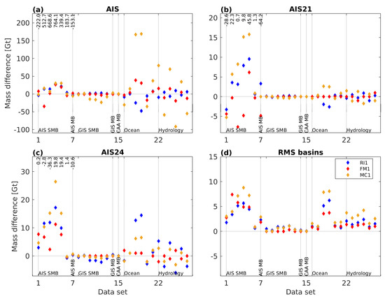 Differences between mass change estimates derived from different synthetic data sets and the corresponding true mass change for (a) the AIS as well as drainage basins (b) AIS21 and (c) AIS24. True (non-zero) mass changes are indicated by numbers at the top margin (unit: gigatons). (d) RMS of the differences for all drainage basins (AIS01–AIS24, AIS27, AIS28).