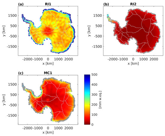 Figure 14 clearly reveals the largest noise standard deviation for the RI1 gridded product, with an RMS of 278.0 mm w.eq. In contrast, the RMS of the noise standard deviation is 70.9 and 38.9 mm w.eq./yr for MC1 and RI1, respectively. Hence, the largest difference in the noise level are evident between RI1 and RI2 with an RMS of 174.6 mm w.eq./yr. This is comparable to what we found for the noise level of the basin-averaged mass change time series (Section 3.3.1 (D)). Since the noise averages out to some extent when integrating over larger regions, the differences between the gridded products are larger than between the basin products, for which the differences among the various products are in general decreasing with increasing size of the basin (Figure 11b).