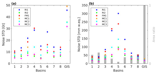 Noise level, given in terms of the scaled standard deviation of the noise time series, for all GIS basins and the entire GIS, derived from (a) the mass change time series and (b) the time series of the average surface density change. Grey bars indicate the ratio between the basin areas and the entire GIS area.
