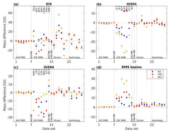 Differences between mass change estimates derived from different synthetic data sets and the corresponding true mass change for (a) the GIS as well as drainage basins (b) GIS01 and (c) GIS04. True (non-zero) mass changes are indicated by numbers at the top margin (unit: gigatons). (d) RMS of the differences for all drainage basins (GIS01–GIS08).