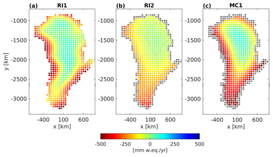 In particular, coastal regions of the RI1 solution are heavily affected by noise, clearly exceeding the 500 mm w.eq. level. Comparable effects of smaller magnitude are visible along the north-eastern coast in the MC1 product. This is comparable to what we found for the AIS and discussed in Section 3.2.3 (D). The north-south-oriented pattern of larger noise at the southern tip of the GIS for RI1 coincides with the region of less pronounced mass loss visible in Figure 13.