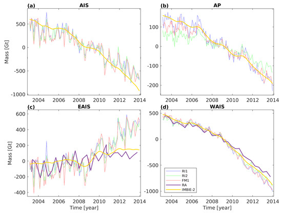 Only a few independent data sets, fulfilling the requirements listed above, are available. We made use of an updated elevation time series derived from several radar altimetry (RA) satellites originally compiled by Shepherd et al. [18]. As described in Section 2.2, the volume-mass-conversion was performed using a prescribed density mask which discriminates between regions where fluctuations in elevation occur with the density of snow or ice [28]. Integrated mass change time series are available for EAIS and WAIS. However, because of the limitations of RA (e.g., sampling issues along the steep coastal margins or errors in the density assumption used for the volume-mass-conversion), this independent data set cannot provide a true reference value suitable to be used in a rigorous validation.