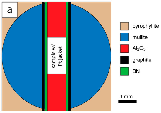 Experiments on fine- and coarse-grained magnesite were performed using the D-DIA at beamline 6-BMB at the Advanced Photon Source at Argonne National Laboratory (Lemont, IL, USA). We used a modified Durham-type assembly [40] which consists of hollow cylinders of boron nitrate (BN) and graphite within a sphere of mullite in a soft-fired pyrophyllite cradle (Figure 1a). This assembly can accommodate a cylinder (or stacked cylinders) 1 mm diameter by 2 mm long, with crushable Al2O3 pistons at each end of the cylinders.