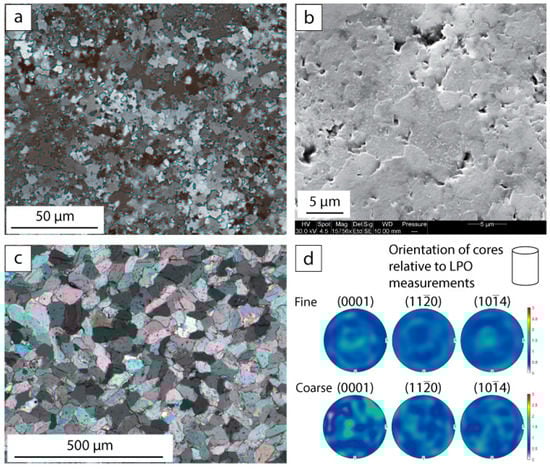 A fine-grained (d ~ 2 +/−0.6 µm) magnesite aggregate from Nevada, USA was used in all experiments performed at T = 500 and 750 °C to determine the pressure dependencies of magnesite aggregates deforming by low temperature plasticity mechanisms and diffusion creep, respectively (Figure 2a,b). A coarse-grained (d ~ 80 µm) magnesite aggregate from Nevada, USA was used in all experiments performed at 900 °C to determine the pressure dependence of the strength of magnesite aggregates deforming by dislocation creep (Figure 2c); this coarse-grained magnesite has previously been used in experiments of [17]. Initial porosities of both starting materials are low (<1 vol%) as determined by density measurements. Initial microstructures and textures of fine-grained magnesite are marked by equant angular grains and little or no lattice preferred orientation (LPO; Figure 2a,b,d). Optical observation of the coarse-grained magnesite reveals straight extinction of individual grains with only few twins and little to no lattice preferred orientation (Figure 2c,d), allowing us to distinguish deformation microstructures generated during our experiments. Inclusions (<<1 vol%) of opaque minerals, possibly ultramafic or altered ultramafic hydrous and oxide phases, are rare. Microprobe analyses (performed with a Cameca SX50 microprobe, Texas A&M University) indicate the fine-grained Nevada magnesite contains traces of Ca (Mg0.996Ca0.004CO3) and no detectable Fe, while the coarse-grained Nevada magnesite contains traces of Ca and Fe (Mg0.994Ca0.004Fe0.002CO3) (Table 1).