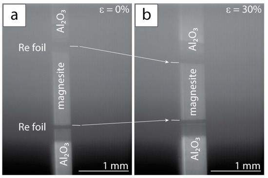 Radiographs of samples collected in-situ were used to determine strain and strain rate during all experiments (MAG_012, T = 900 °C, Peff = 5.8 GPa, = 3.3 × 10−5 s−1, σdiff = 1.6 GPa, (a) prior to deformation and (b) at ε = 30%). Measurements of sample length were collected from the interface between the magnesite cylinder and Re foils (dark lines, measurement location highlighted by white line). The darker grey area in the Al2O3 pistons is where the Pt jacket overlaps the Al2O3 pistons. The black areas to the sides of the load column are caused by the WC anvils that absorb X-rays and partially block the view of the magnesite cylinder and Al2O3 pistons, which are transparent to X-rays.