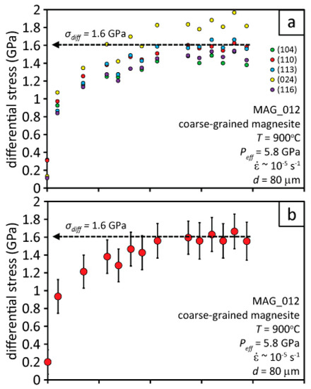 where σcorr is the corrected stress, and σSSA is the stress calculated from force measurements [51]. This correction appears to be independent of pressure within the range of calibration experiments (P = 0.3–1.5 GPa, σSSA = 10–750 MPa, T = 600–1300 °C; [51,53,54]) and has been partially duplicated [55].