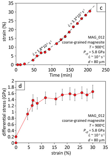Coarse-grained (d ~ 80 µm) magnesite cylinders were deformed at T = 900 °C, = 2.9–3.5 × 10−5·s−1, and four pressures (Peff = 2.9, 5.2, 5.8, 6.3, and 7.5 GPa) in the D-DIA apparatus to strains of 36, 30, 30, 27, and 36%, respectively (Table 3). In all experiments, differential stress increased rapidly as the load rams were advanced and the magnesite yielded at low strains (ε ~ 3%) (Figure 5c). After yielding, differential stresses increased slowly until ε ~ 15% and reached a constant value at higher strains until the end of the experiment.