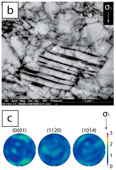 EBSD measurements of the orientations of grains of the magnesite deformed at Peff = 6.6 GPa to ε = 27% (MAG_004) reveal a weak [0001] point maxima parallel to the compression direction (Figure 6).