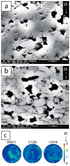 Strengths of fine-grained magnesite deformed at T = 750 °C are lower than those of fine-grained magnesite deformed at T = 500 °C, but they also increase with increasing pressure (Figure 5). The mechanical behavior and microstructures of these magnesite samples are consistent with those observed for fine-grained magnesite deformed by diffusion creep [17], similar to diffusion creep and grain boundary sliding of other carbonates [58,59,60].