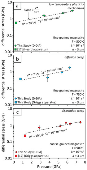 The strengths of magnesite aggregates deformed at T = 500 (a), 750 (b) and 900 °C (c) all increase as a function of increasing pressure. Activation volumes (V*) for magnesite deformed by LTP mechanisms, diffusion creep and dislocation creep are 34, 2 and 10 × 10−6 m3 mol−1.