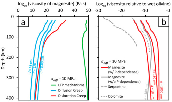 We have used our revised flow laws for LTP mechanisms, diffusion creep and dislocation creep of magnesite aggregates to calculate the viscosity of each magnesite deformation mechanism in a subducting slab assuming: (1) the temperature-pressure path determined by [65] and (2) a differential stress of 0.01 GPa along the entire length of the subducting slab (Figure 10). Diffusion creep is the dominant deformation mechanism along the entire subduction path if the grain size is equal to or less than the recrystallized grain size predicted by the Twiss [66] recrystallized grain size-stress piezometer (d = 180 µm) for a differential stress of 0.01 GPa (Figure 11a). However, if the grain size is coarser than 180 µm, dislocation creep may become the dominant mechanism (Figure 11a).