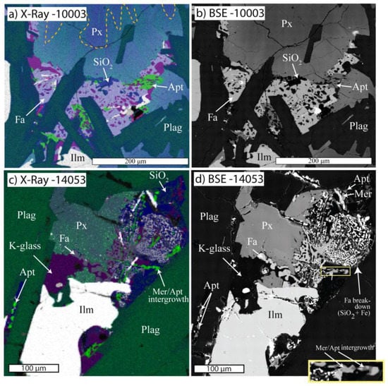 The total mesostasis volume within this sample is ~ 0.8 vol% []. Combined false-color x-ray maps and BSE images for the representative mesostasis pockets investigated for 10003 (reported by []) are displayed in Figure 1a,b. Mesostasis pockets in this sample range in size from ~ 50 to 500 μm. A full petrographic description is found in [] and is summarized here. Major element abundances for two mesostasis pockets are reported in the Supplementary Materials tables (Table S1). Typical mineral assemblages contain ‘globules’ of a Si-K-Ba-rich feldspathic glass (hereafter referred to as K-rich glass) set within a melt matrix of fayalite (Fa). These intergrowths (Figure 1) are commonly referred to as ‘sieve’ textures and are characteristic of conjugate immiscible liquids (SLI, [,,]). The fayalite composition is relatively uniform (Fo < 10), whereas the K-glass displays significant chemical variations, ranging from dominantly rhyolitic to almost pure K-feldspar (K2O ranges from 3.3 to 11 wt%, and SiO2 from 55 to 78 wt%). We refer to the K-rich patches as ‘glass’ because they are locally isotropic in cross-polarized light. Minor, but important phases within the mesostasis pockets are apatite, small ilmenite, and SiO2 grains (Figure 1a,b). Hyalophane, a Ba-rich K-feldspar, is also locally present, as well as scarce merrillite.