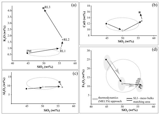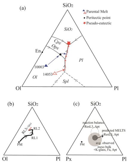 This sequence matches our thermodynamical modeling results (see Section 4.2 and Figure 2 and Figure 3), as well as the general crystallization trend reported by other studies [,,,] based on petrological observations. In order to model mesostasis crystallization (in the reaction sequence outlined in more detail below), we have started with a parental melt that produces a series of residual melts (ResLiq1, ResLiq2, ResLiq3) during partial crystallization (Figure 2b,c and Figure 3). The residual-melt composition for a given reaction is then used as the starting point for the second reaction, and so forth, thus maintaining full integrity of the system. As such, small changes in the first reaction will affect the stoichiometric coefficients of the last reaction, and provide a ‘reality check’ (examples highlighted below). Once the residual interstitial liquid reaches the pseudo-eutectic (i.e., ResLiq 3), this melt represents the precursor of the mesostasis pocket and is likely to have quenched and/or crystallized in a closed system. Thus, the bulk chemistry of the mesostasis pocket shown in Figure 1 is considered to reflect the composition of the mesostasis precursor melt (referred to here as ResLiq3, see below).
