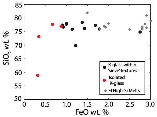 SiO2 wt% vs. FeO wt% for K-glass (black circles) associated with immiscible ‘sieve’ textures and K-glass isolated from Fa (red circles). For comparison, reported high-Si and high-K immiscible liquids (quenched as glass) within olivine melt inclusions (FI, gray circles) are plotted (data from [,]). Glass associated with immiscible liquids is characterized by FeO > 1 wt%, whereas glass not associated with immiscible liquids (i.e., not associated with Fa) and characterized by Fe < 1 wt%.