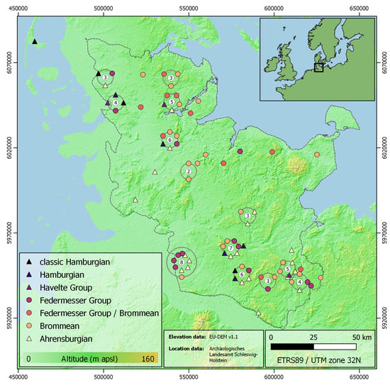 Data on prehistoric activity from different epochs are available for the study area. In this study, we focused on the human reoccupation that occurred during the Late Weichselian. This Final Palaeolithic material is mainly distinguished by characteristic lithic artifacts attributed to the classic Hamburgian, Havelte Group, Federmesser-Groups, Brommean, and Ahrensburgian. The material of the Hamburgian and Havelte Group reflects the first recolonization of northern Germany by hunter–gatherers after the last glacial maximum, and it dates approximately to the period of the early amelioration of the Weichselian Lateglacial (cf. Greenland Interstadial 1e/d; ca. 12,690–11,970 years cal. BCE) [