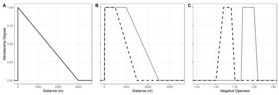41]. Accordingly, each raster cell was assigned a value corresponding to the membership degree of the fuzzy set (