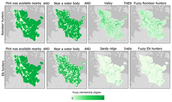 40], were introduced as crisp variables and intersected with the ridge fuzzy set. The previous steps resulted in two raster data sets that contained the membership degree for the hypothesis of the distribution of reindeer hunters and elk hunters (