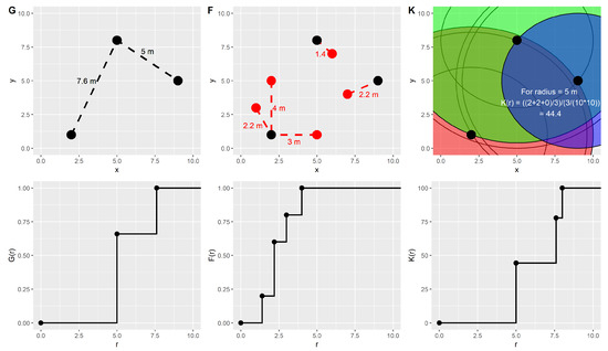 45] (p. 204). Unlike the F- and G-function, the K-value is standardized by dividing the number of points by the intensity; that is, the total number of points is divided by the area extended by the locations of all points [