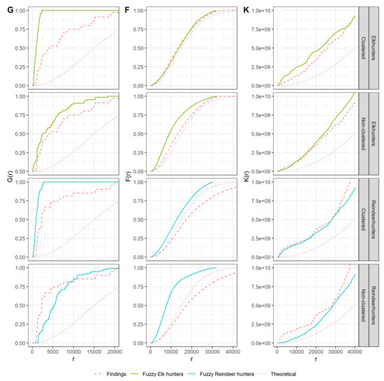 45] (p. 262). For the elk hunters, this function does not distinguish between the actual locations and a completely random point pattern. The points distributed in clusters according to the fuzzified hypotheses also reflect this. For reindeer hunters, the line of actual sites falls short of the theoretical distribution, indicating a clustered point pattern [