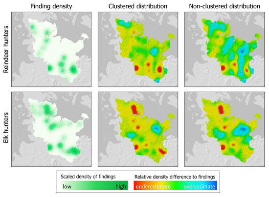 Figure 6). The densities of the actual finds differ between the elk hunters and reindeer hunters. Especially in the northern part of the study area, the find densities for elk hunters are higher than those for reindeer hunters. In the locations of the elk hunters, both the clustered distribution and the non-clustered distribution are observed to have considerably lower point densities at the actual sites. The non-clustered distribution is closer to the actual point density only in the southeast. However, although the positive deviations resulting from both methods tend to be higher in the areas with lower find densities, they are smaller in the clustered distribution and thus better correspond to the find situation. This trend toward greater overestimation in the areas of low find density by the non-clustered distribution is even more evident among reindeer hunters (as indicated by the large blue areas in