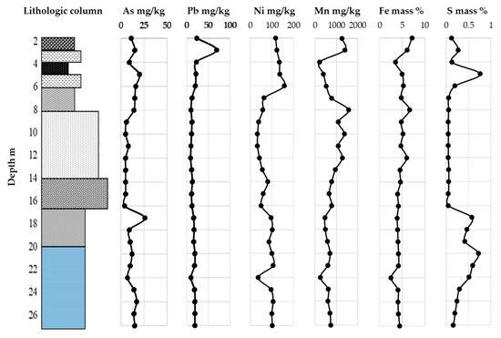 Total content of As, Pb, Ni, Mn, Fe, and S in core sediment.