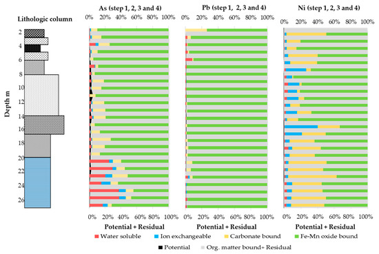 Percentage of water soluble (step 1), ion exchangeable (step 2), carbonate bound (step 3), Fe–Mn oxide bound (step 4), potential (all four steps together), and residual (Org. matter bound + Residual) fractions for As, Pb, and Ni.