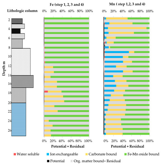 For Fe, the fractions in the core sediment followed the trend Fe–Mn oxide bound > carbonate bound, whereas water soluble and ion exchangeable fractions were unavailable from the potential mobile fractions. Residual and organic matter bound were the main parts, i.e., more than 99% of the total concentration. The higher amount of Fe in the residual and organic matter bound reflects its strong immobile bonds in crystalline structures (e.g., magnetite, goethite, and hematite) [54]. Moreover, the speciation trend implies very poor leaching behavior of both marine and nonmarine sediment under various environments (neutral, oxidizable or reducible, etc.). The Fe–Mn oxide bound percentage was relatively high (up to 1%) in the upper part of the core, where alluvial, tuffaceous clay and peat were distributed up to 8 m from the top (Figure 5).