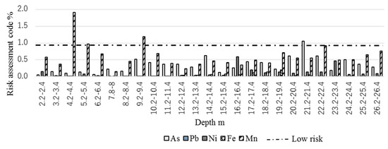 Calculated risk assessment code for As, Pb, Ni, Fe, and Mn.