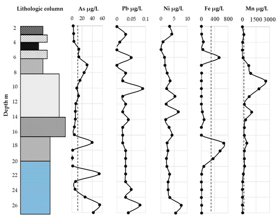 The pore water concentrations of As and other elements are plotted in Figure 7. The concentration of As exceeded the permissible limit of 10 µg/L [55,56] for leachate and drinking water in some samples. A concentration was 29.79 µg/L was observed in the nonmarine tuffaceous clay at a depth of 7.8–8 m, which was about 3 times the permissible limit. In fluvial sediment, which was just below the tuffaceous clay, the concentrations were 23.99 µg/L and 15.95 µg/L at a depth of 8.2 and 9.2 m, respectively. The concentration exceeded the permissible limit.