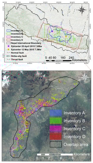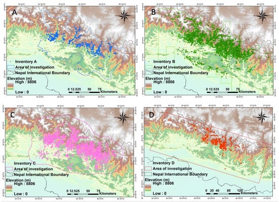 Landslide mapped after the 2015 Gorkha earthquake for the affected region. (A) Inventory A, (B) inventory B, (C) inventory C, and (D) inventory D.