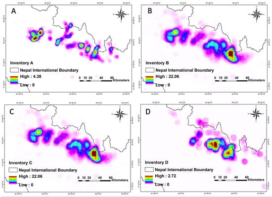 Landslide inventory densities per km² for the Gorkha event. (A) Inventory A, (B) inventory B, (C) inventory C, and (D) inventory D.