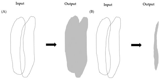 (A) Example of a union with features within a feature class that overlaps. (B) Example of an intersection with a feature within a feature class that overlaps.