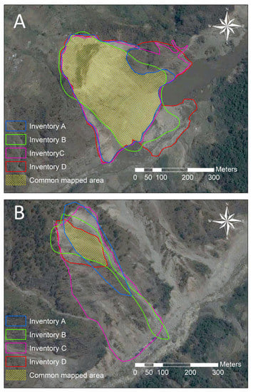There are different numbers of mapped landslides for the same area interpreted by different interpreters, which related to the scale of working, applied EO spatial resolution, personal perspective, and the method of mapping that was adopted. Inventory C (Figure 10C) and inventory D (Figure 10D) landslides were mapped using Google Earth imagery; 197 and 336 landslides were mapped, respectively. In Figure 10A, inventory A had 144 landslides for the same common area using Google Earth imagery. Figure 10B shows 498 landslides in inventory B, which was the result of using high-resolution Digital Globe WorldView 2–3 satellite imagery by the author. However, it should be mentioned that very high resolution (VHR) optical satellite imagery can have significant distortions and georeferencing errors in high-relief areas if they are orthorectified using only provided rational polynomial coefficient (RPC) models and not by using manual ground control points (GCPs). Also, this can be more severe, as many of the VHR rapid emergency acquisitions over a disaster area-of-interest can have small incidence angles, thus increasing automatic orthorectification errors. Differences in the mapped outlines of landslides can be due to this. The offset from automatic RPC processing is no less than 5 m for the newer sensors (WorldView 2- 3, Pleiades) and even less for older satellites (GeoEye-1, etc). High mountain relief and low-resolution digital elvetaion model (DEM) used for orthorectification (e.g., Shuttle Radar Topography Mission (SRTM), Advanced Spaceborne Thermal Emission and Reflection Radiometer (ASTER) or Advanced Land Observing Satellite (ALOS) may add more possible errors to these offsets [].