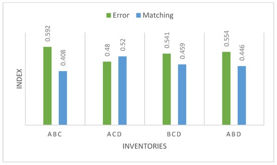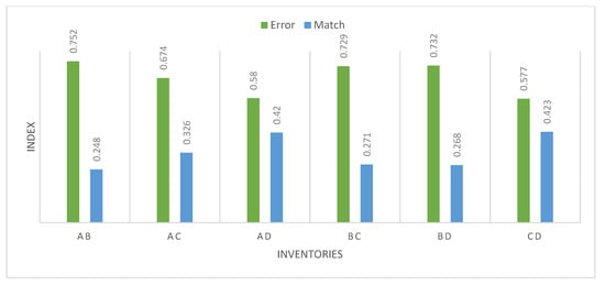 where E is the mismatch and M is the matching between the inventories. Union and intersection are used in Equation (1) to observe the matching and mismatch between the inventories.