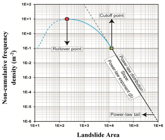 Figure 8 shows the power-law distribution for medium to massive landslides and divergence from the power-law toward lower frequencies with a rollover point, where frequency decreased for smaller landslides. The trend of the FAD of most landslide inventories diverged from the power-law for small landslides [,,,]. The point where this divergence began was defined as the cut-off point [,]. For non-cumulative probability density distributions of landslide areas, the peak point of the probability distribution curve, after which the probability value began to decrease for smaller landslides following a positive power-law decay, was referred to as the rollover point []. According to [], in a power-law distribution, the slope of the distribution was defined with a power-law exponent. The part that was represented by large events was referred to as the power-law tail, as shown in Figure 9 (with a scaling parameter, β). Malamud et al. [] investigated four well-documented landslide events and concluded that rollover was a real phenomenon for landslide-event inventories, depending upon the bias and under-sampling of the smaller landslides. They modeled the FAD for these four inventories and established theoretical curves to estimate the total landslide area triggered by an earthquake or rainfall event.