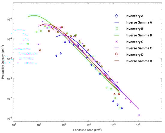where is the parameter primarily controlling power-law decay for medium and large values, is the gamma function of , is landslide area, is the location of rollover point, is the exponential decay for small landslide areas, and is the power-law exponent. Malamud et al. [] provided a best fit for the power-law exponent and showed that = 2.4.