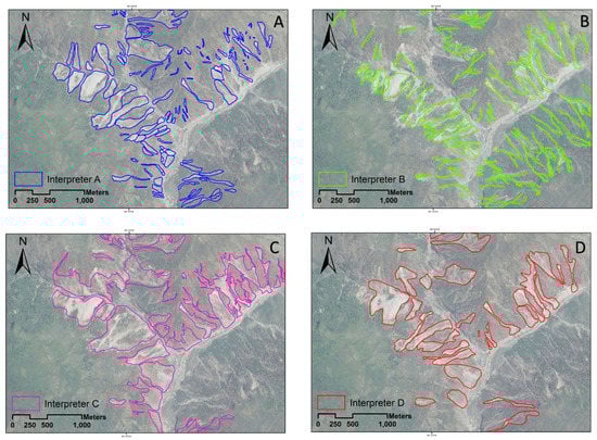 The availability of four independent landslide inventories for the same triggering event in the same geographical area allowed us to quantitatively compare and outline strengths and weaknesses of the methods used to prepare the inventories. The inventory by interpreter B (Figure 10b) portrayed more landslides (498) than the other inventories. This difference was significant, as the other interpreters could not detect most of the smaller landslides visually using Google Earth imagery, which was used to prepare the three inventories by interpreters A, C, and D. The more significant number of landslides in the inventory by interpreter B with the very high-resolution Worldview imagery used for the visual identification of the landslides, compared to the spatial resolution of the satellite imagery used for the other inventories, is explained here. The amalgamation of the landslide information merged multiple very small landslides into a single larger landslide, reducing the total number of the mapped event landslides. Considering only the number of landslides, quantitative identification could not be performed because of both the amalgamation of adjacent landslides and the subjectivity of the landslide extraction process. Many factors caused the amalgamation of landslides in a landslide inventory map. The manual extraction of landslide borders and representation with polygons is a subjective process that is affected by the applied method, the preferences of the experts and interpreters, and how much time and effort are invested into the inventory generating process []. Amalgamation is the mapping of nearby smaller landslides as a single polygon, which may lead to possibly severe distortion of the statistical analysis of these inventories. An adjacent landslide polygon is usually described as a single polygon if the runouts or scars overlap in areas. Thus, differentiating between them is difficult. Low image resolution, the working scale, and the contrast between affected and unaffected areas are all other reasons for amalgamation []. In some regions, landslides can be very condensed, and several contiguous landslides may join runout areas. Amalgamation is often due to errors resulting from a lack of expertise of the interpreter. It may also happen when landslide inventory mapping is carried out using (semi)-automated classification and change detection based on optical satellite images, e.g., [].