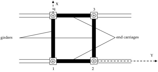 In order to provide proper work of the crane bridge, it is necessary to maintain perpendicularity of end carriages and girders, as well as parallel end carriages and girders (Figure 1). Most cases described in the available literature have not taken this issue into account while performing various types of specialized analyses [9,12,13].