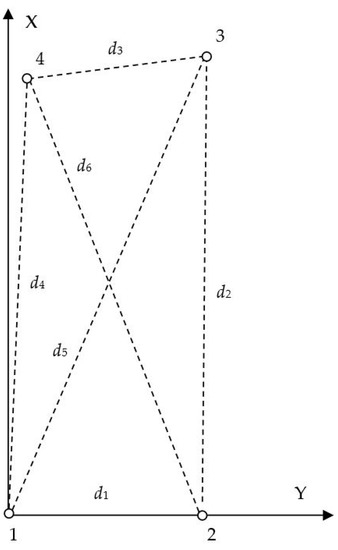 The coordinates presented in Table 3 made it possible to determine the distance between particular controlled points (Table 5) and the values of mean errors obtained from the Relation (12) (, is the diagonal element of the matrix). These distances will be further considered as pseudo-observations.