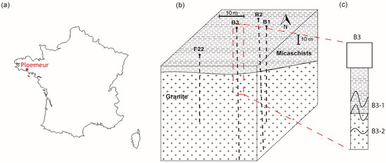 The single-well thermal tracer tests were carried out at Stang er Brune, which is part of the Plœmeur field site belonging to the French hydrogeological observatories network H+ [41] and the French Network of Critical Zone Observatories OZCAR (Observatoires de la Zone Critique: Applications et Recherche) [42] The Plœmeur site corresponds to a fractured crystalline aquifer that provides ~ 1 million m3 per year to supply drinking water to the city of Plœmeur (20,000 habitants) [43] (Figure 1a). The experimental site of Stang er Brune, which is not influenced by the pumping, is located near the outcrop of a permeable contact zone between granite and mica-schist which deeps toward north. Three open boreholes of about 100 meter deep, cross the contact zone at 40 meters deep (Figure 1b). The high connectivity and transmissivity of fractures at different depths allowed the implementation of innovative experiments [23,30,38,44] during the last few decades, to characterize the impact of heterogeneity of fracture media properties on flow and transport.
