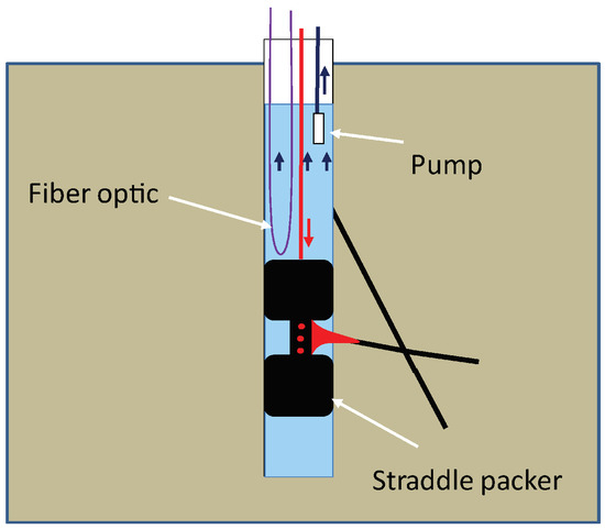 Thermal tracer tests are usually achieved in cross-borehole configuration [2,22,28]. However, as shown by de La Bernardie et al. [5], single-well thermal tracer test can be an alternative to cross-borehole tracer test. It consists of injecting hot water within a fracture isolated by a straddle packer (or double packers) and withdrawing water above in the same borehole. Such vertical dipole configuration has already been developed in porous media for hydraulic and solute tracer tests to characterize the vertical hydraulic heterogeneity of porous aquifer [34,35,36]. In the present study, we choose this experimental setup since the excellent hydraulic connection between two fractures crossing the same borehole was confirmed thanks to previous tracer tests using dissolved helium and amino G acid [37]. As we targeted the two shallowest flowing fractures of the borehole (B3-1 and B3-2), localized thanks to previous hydraulic experiments [38], we did not isolate the upper fracture from the top part of the borehole. The setup used is fully described in de La Bernardie et al. [5] and briefly explained below.
