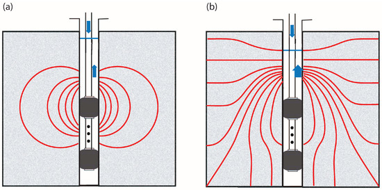 To better highlight the effect of flow configurations on streamlines and thus on thermal recovery, Figure 3 shows a conceptual scheme of the experiments in convergent and perfect dipole configurations. For simplicity, the scheme of Figure 3 represents streamlines in homogeneous media. In fractured media, streamlines may be much more complex and dependent on local fracture geometry. For the convergent dipole tracer tests, withdrawal flow rates were higher than injection flow rates (I and II in Table 1) while for the perfect dipole tracer test (III in Table 1), injection and withdrawal flow rates were similar. Because the amount of water withdrawn equals the amount of water injected for the perfect dipole test, all water injected should be withdrawn and the streamlines are expected to have spherical shapes [46,47] (Figure 3a). In this configuration, recovery of a conservative solute tracer should be perfect while heat recovery should only depend on heat conduction along the streamlines. For the convergent case, where the pumping rate is higher than injection rate, the pumping withdraws water from a larger volume of investigation and not only from the injection chamber [29] (Figure 3b). In this configuration, temperature is expected to be diluted proportionally to the pumping flow rate while the spreading of heat will be limited to few streamlines around the borehole (Figure 3b). Thermal conduction in the surrounding rock will only take place in the vicinity of the well, along the streamlines that connect the injection to the withdrawal chamber as shown in Figure 3b. To summarize, in perfect dipole configuration, heat recovery may be more affected by the spreading of heat and conduction within the rock matrix, while in convergent dipole thermal tracer test, breakthrough curve may be principally controlled by advection. Note that in the present study, flow conditions are comparable to the conceptual scheme of Figure 3 only during the heat injection. During the recovery period, only pumping occurs, which should change streamline shape and flow pathways. In convergent dipole, streamlines should not change significantly as flow field is weakly disturbed by injection due to the predomination of pumping flow rate. In perfect dipole, when injection is stopped, the streamlines which spread heat in a large volume away from the borehole are not in function anymore and only heat stored in the neighborhood of the well should be recovered.
