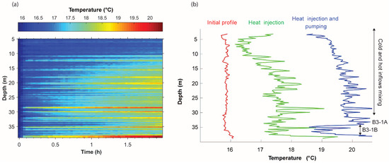 To characterize and localize heat losses that occur during heat injection all along the injection tube, we achieved a heat injection test without pumping (Experiment IV in Table 1). Figure 5a displays the temperature records measured by FO-DTS along the injection tube during Experiment IV. Rapidly after injection start, stripes of variable temperatures appear due to discontinuities in injection sleeve insulation as mentioned previously in Section 3.1. Figure 5b presents three temperature profiles measured by FO-DTS: In ambient condition before the beginning of the injection, 1 h 30 min after heat injection starts without any pumping and 1 h 30 min after heat injection starts with pumping during Experiment III. This demonstrates that after the same injection duration, a difference of more than two degrees can be observed between both tests in the water column above 34 m. This difference confirms the presence of a hot inflow coming from the fracture at 34 m (B3-1A fracture). At B3-1B depth, an increase of temperature is also highlighted between both tests. This observation confirms that B3-1B is connected to B3-2, but with higher thermal attenuation.